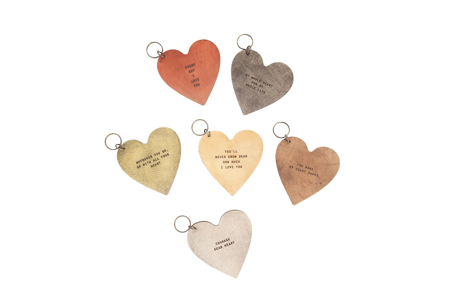 These leather heart keychains are cut from natural hide and finished with simple, meaningful quotes designed to be carried every day. Each heart features its own color and sentiment, offering a small but thoughtful way to mark connection, encouragement, or love. With natural texture and variation, no two pieces are exactly alike.