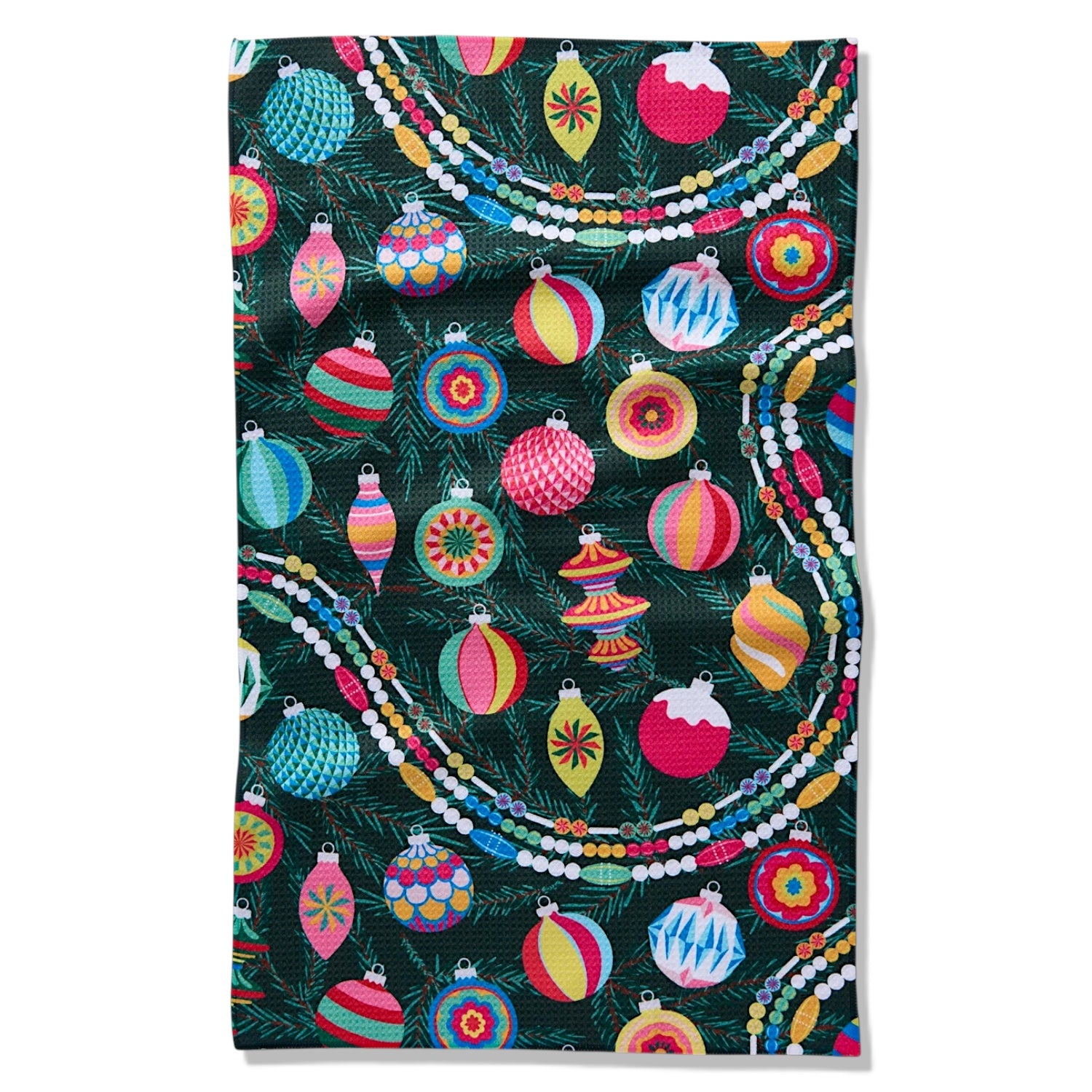 This tea towel features a festive, vintage-inspired Christmas pattern filled with colorful ornaments and garlands. The background is a deep evergreen hue resembling tree branches, while the surface is scattered with ornaments in bright reds, yellows, blues, and greens—each with a different shape and design. Strings of beaded garland wind playfully throughout, giving the towel a cheerful and nostalgic holiday feel. r kitchen. A cheerful addition that captures the magic of the season with every use.