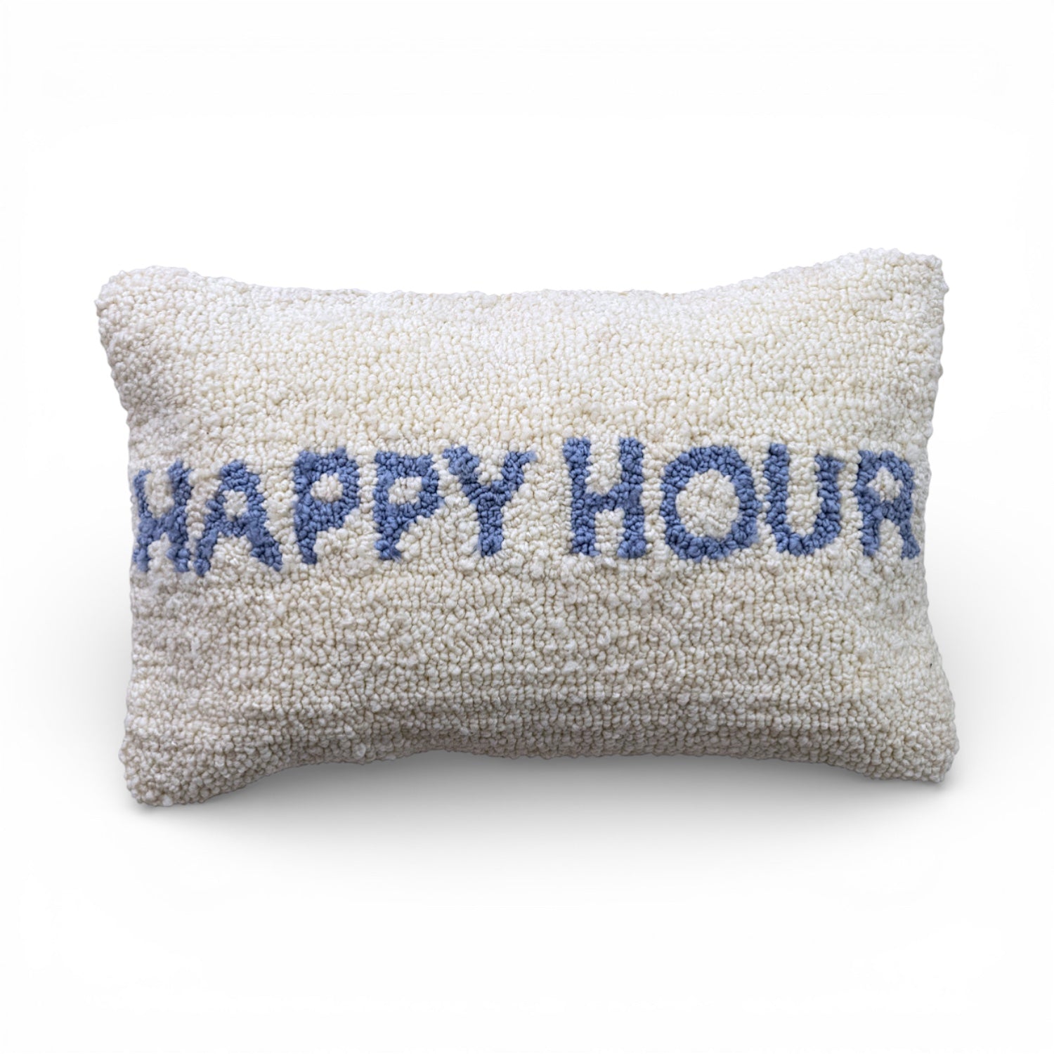 Soft, textured, and ready for gathering, this cotton tufted lumbar pillow features a cozy natural base with raised blue “Happy Hour” lettering across the front. The looped tufting adds depth and dimension, giving it a relaxed, lounge-worthy feel that pairs beautifully with neutral sofas and layered textiles. Its compact size makes it perfect for styling a bar cart nook, reading chair, or entertaining space.