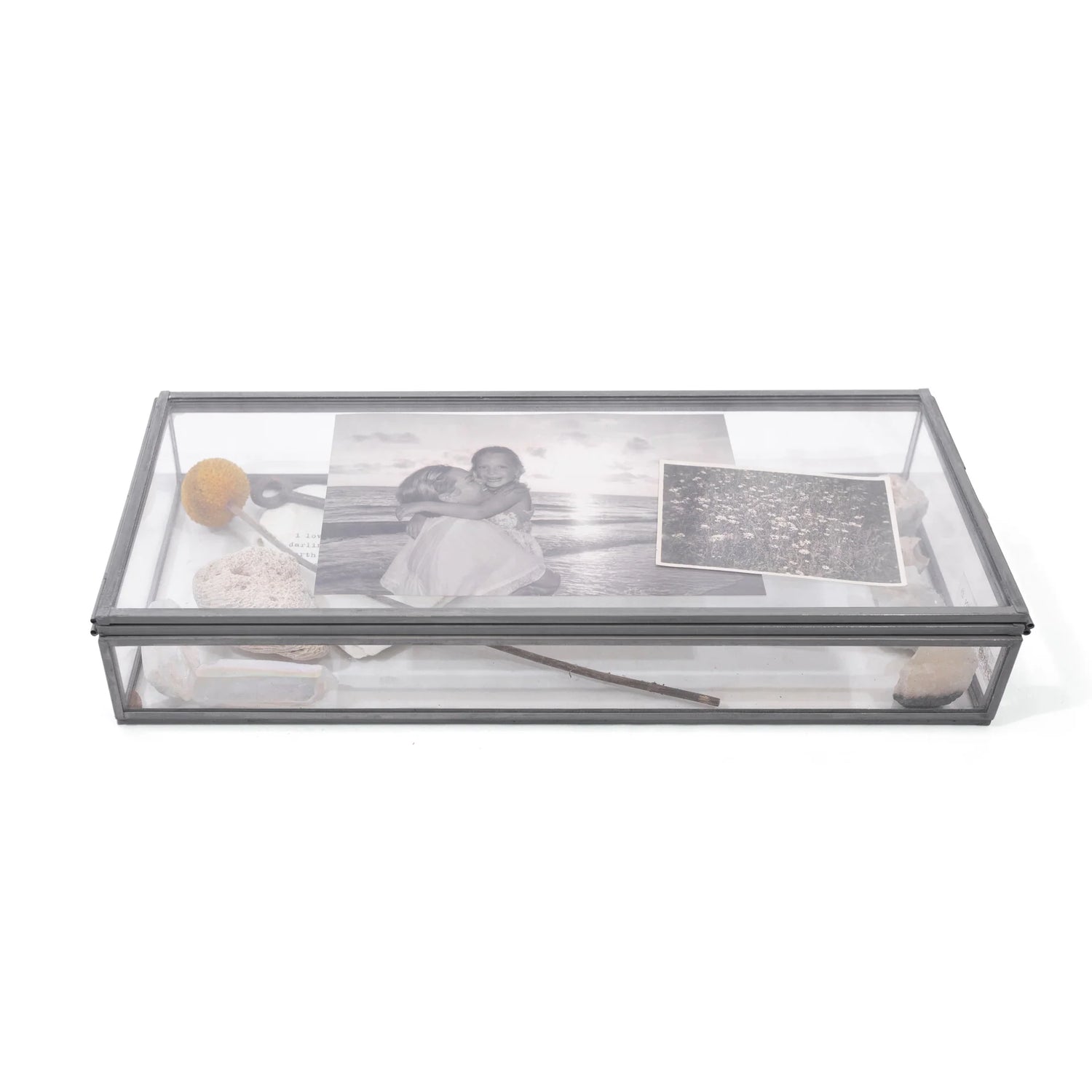 This skinny rectangle memory box is designed to hold the small, meaningful pieces that tell a bigger story. Crafted from clear glass and zinc, it offers a simple way to display photographs, handwritten notes, ticket stubs, and keepsakes collected along the way. Thoughtful in both form and purpose, this box is meant for celebrating the moments and people that matter most.