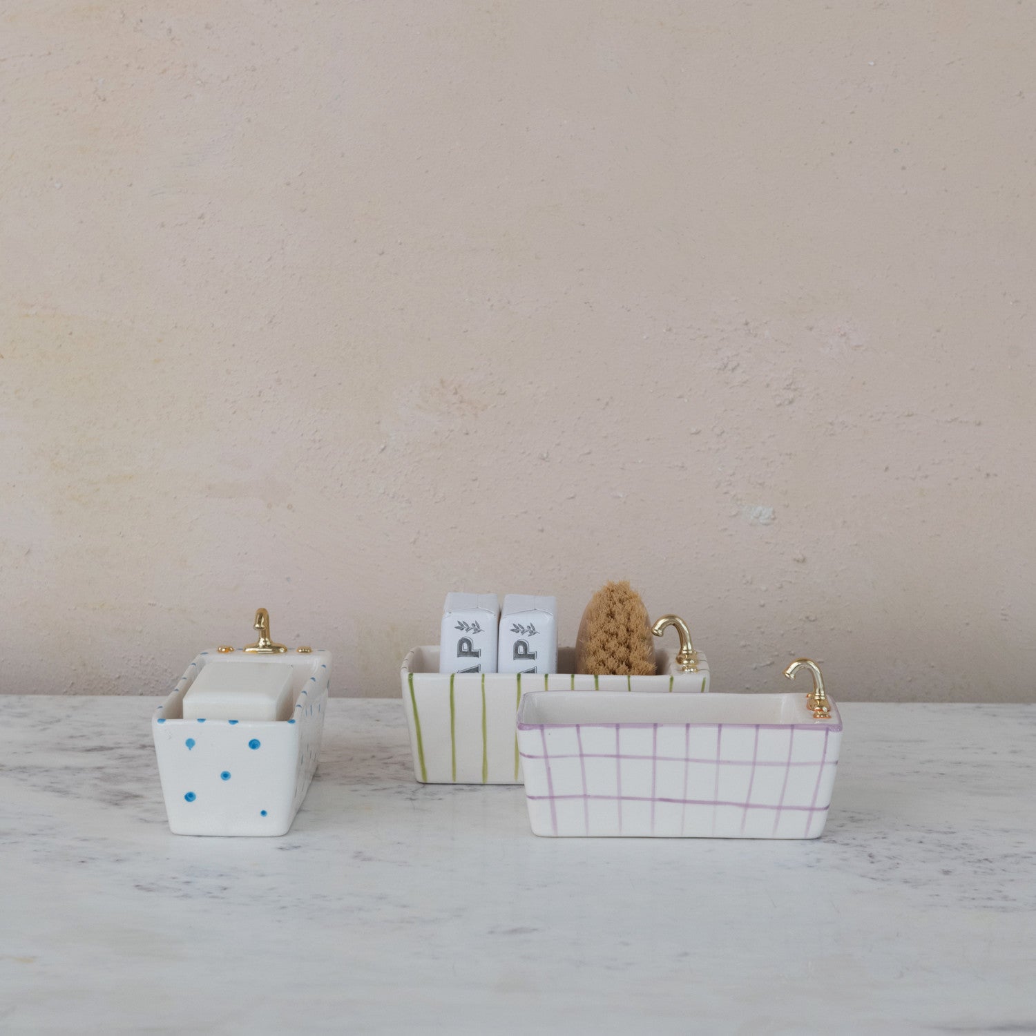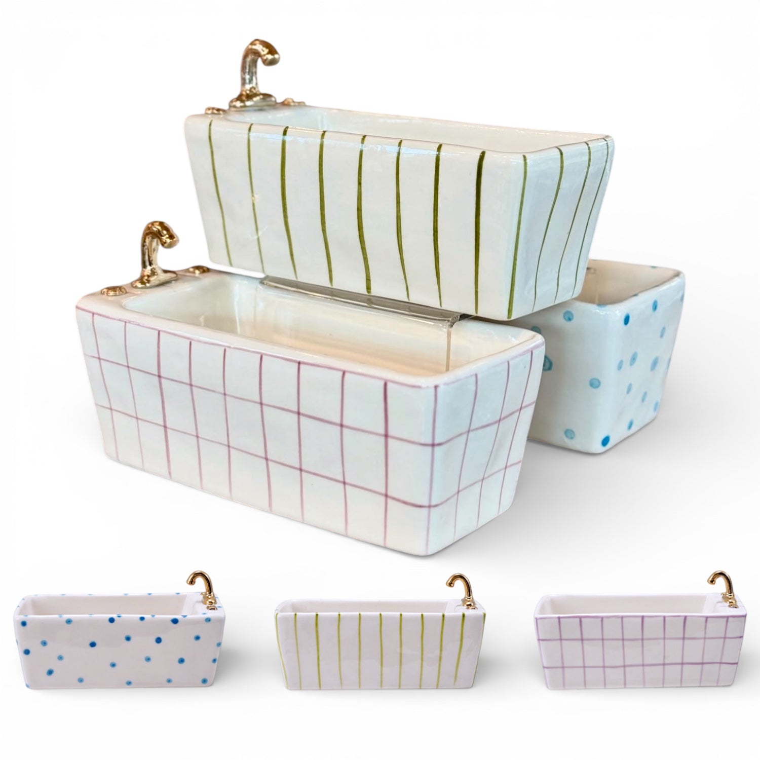 This playful stoneware dish is shaped like a vintage clawfoot bathtub, complete with a tiny gold-tone faucet and hand-painted patterns. Each piece is carefully finished with unique detailing, giving it a lighthearted yet artful presence on a countertop, nightstand, or vanity. The compact tub shape makes it ideal for holding small everyday items while doubling as a decorative accent.