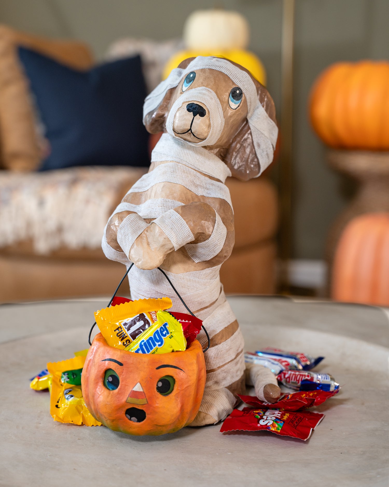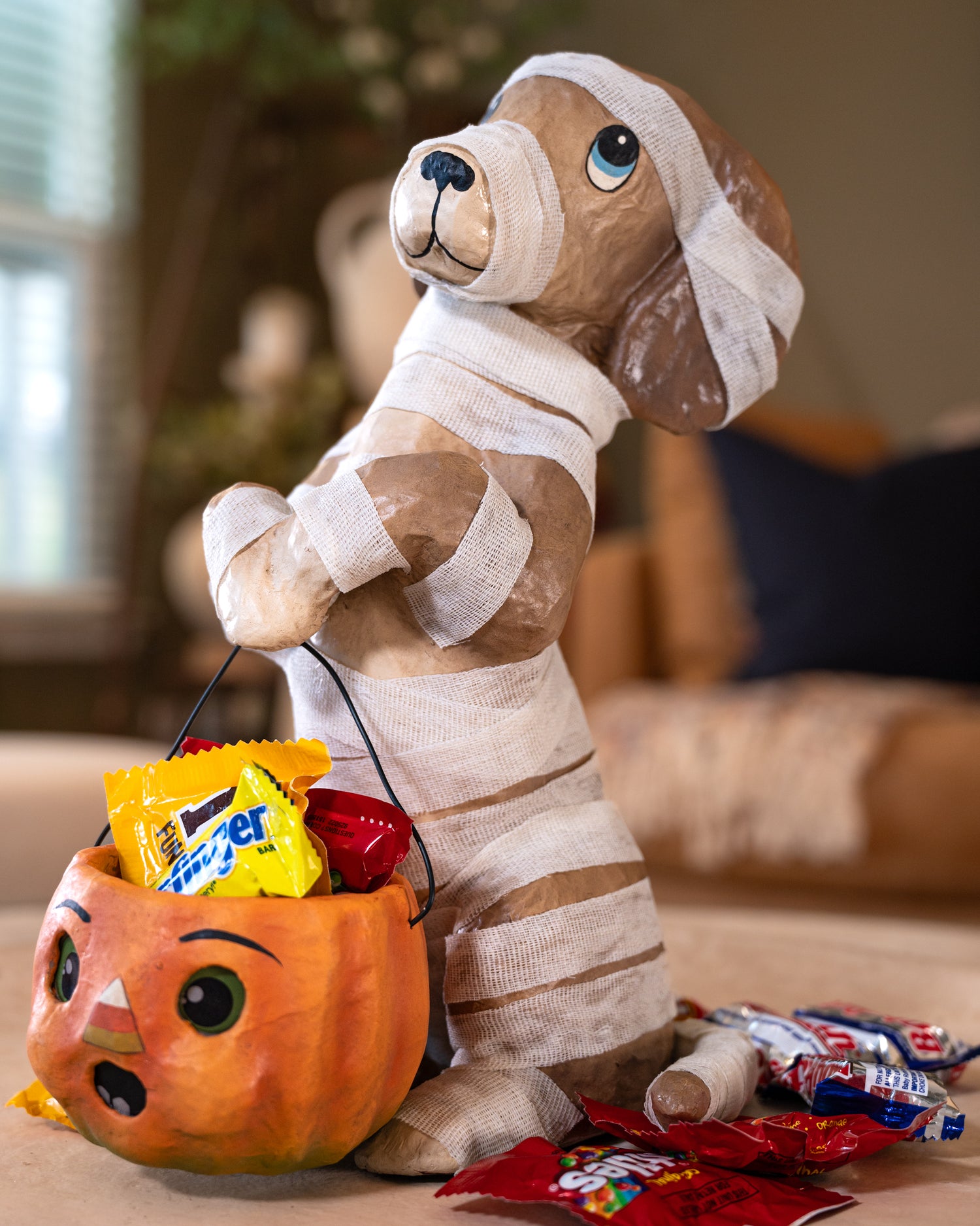 Trick or treat? We hope it's treat! Made by Bethany Lowe Designs, this pup dressed in a white gauze mummy costume is the perfect way to welcome guests into your home this Halloween. Place a handful of snack size candy bars in his little pumpkin bucket or you can place a tea light candle in his bucket to illuminate his path as he trick-or-treats in your neighborhood. 🐶