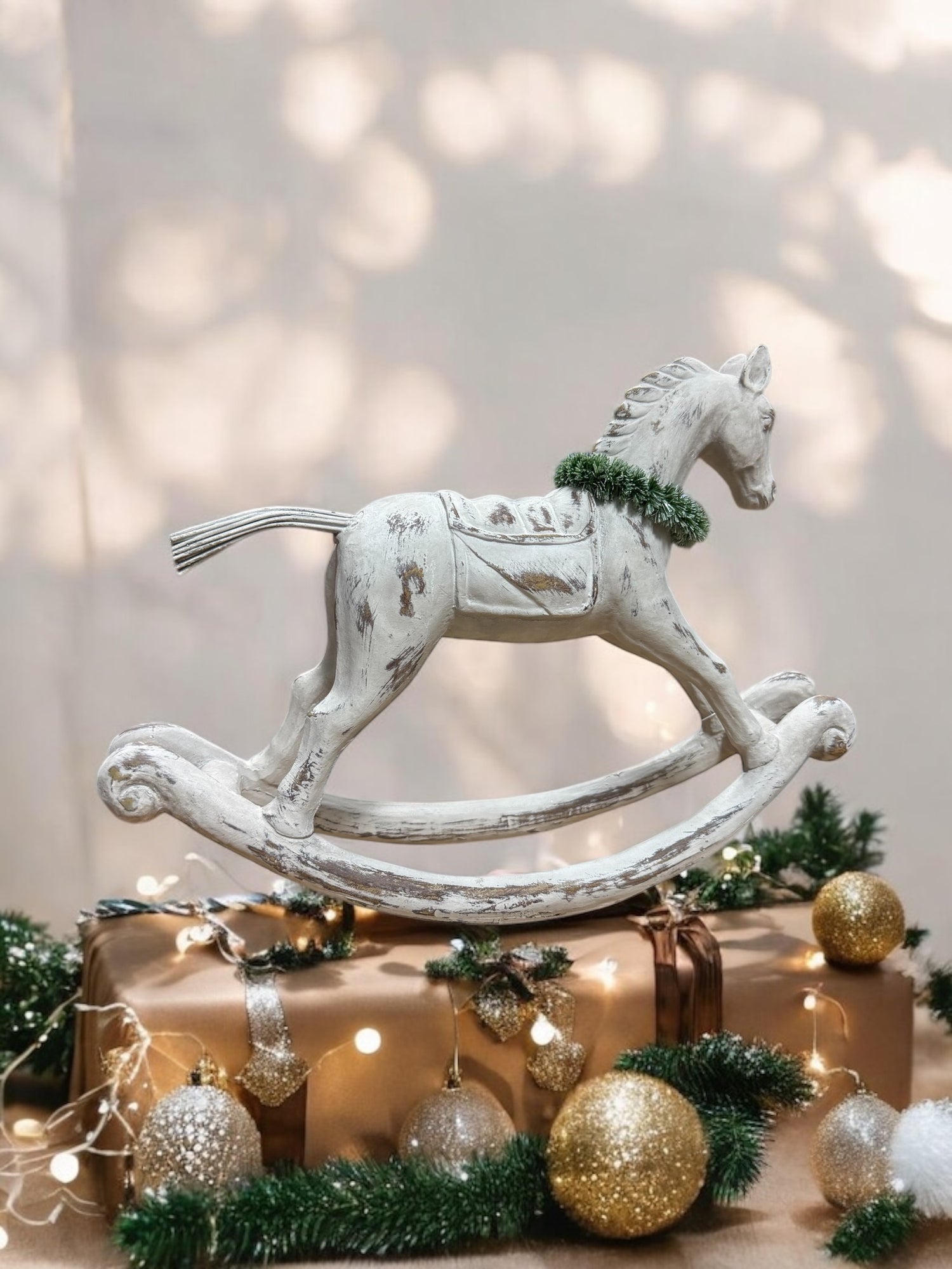 Capture the charm of vintage-inspired décor with this small, tabletop size distressed white rocking horse. Crafted from stonepowder and resin, this elegant piece features a weathered finish that enhances its antique appeal. The graceful design and curved rockers make it a timeless decorative accent, perfect for mantels, bookshelves, or seasonal displays. A delicate green wreath around its neck adds a festive touch, making it ideal for holiday styling or year-round vintage charm.