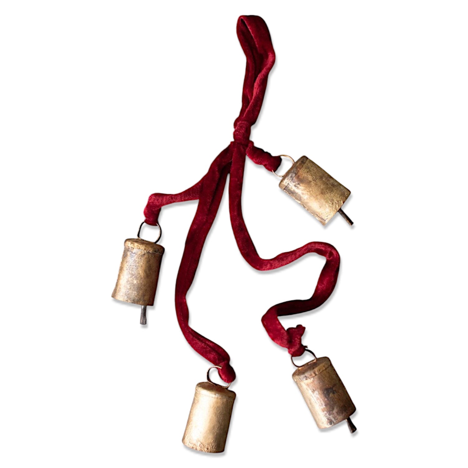 Ring in the holiday season with this beautifully crafted metal bell cluster, featuring four rustic metal bells suspended from a rich velvet rope. Reminiscent of vintage holiday decor, this festive accent piece evokes memories of Christmas past while adding a warm and welcoming touch to any space. Hang it on a door, mantle, or wall to create a festive ambiance or use it as a unique addition to your holiday display.