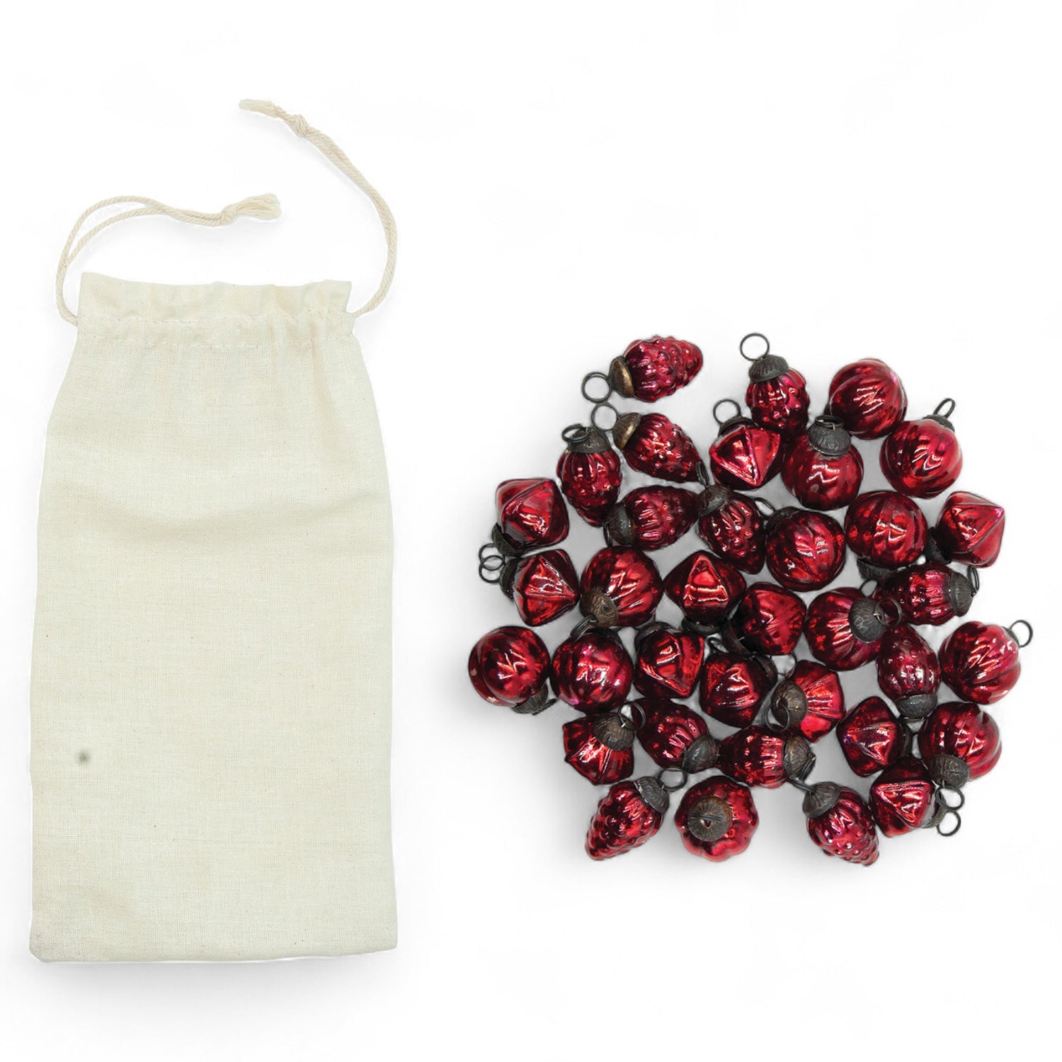Add vintage holiday sparkle to your décor with this set of red mercury glass ornaments. Each ornament features embossed detailing and an antique-inspired metal cap for a timeless look. Perfect for trees, garlands, or tabletop bowls, this versatile collection arrives in a reusable muslin storage bag—ready to enjoy or gift.