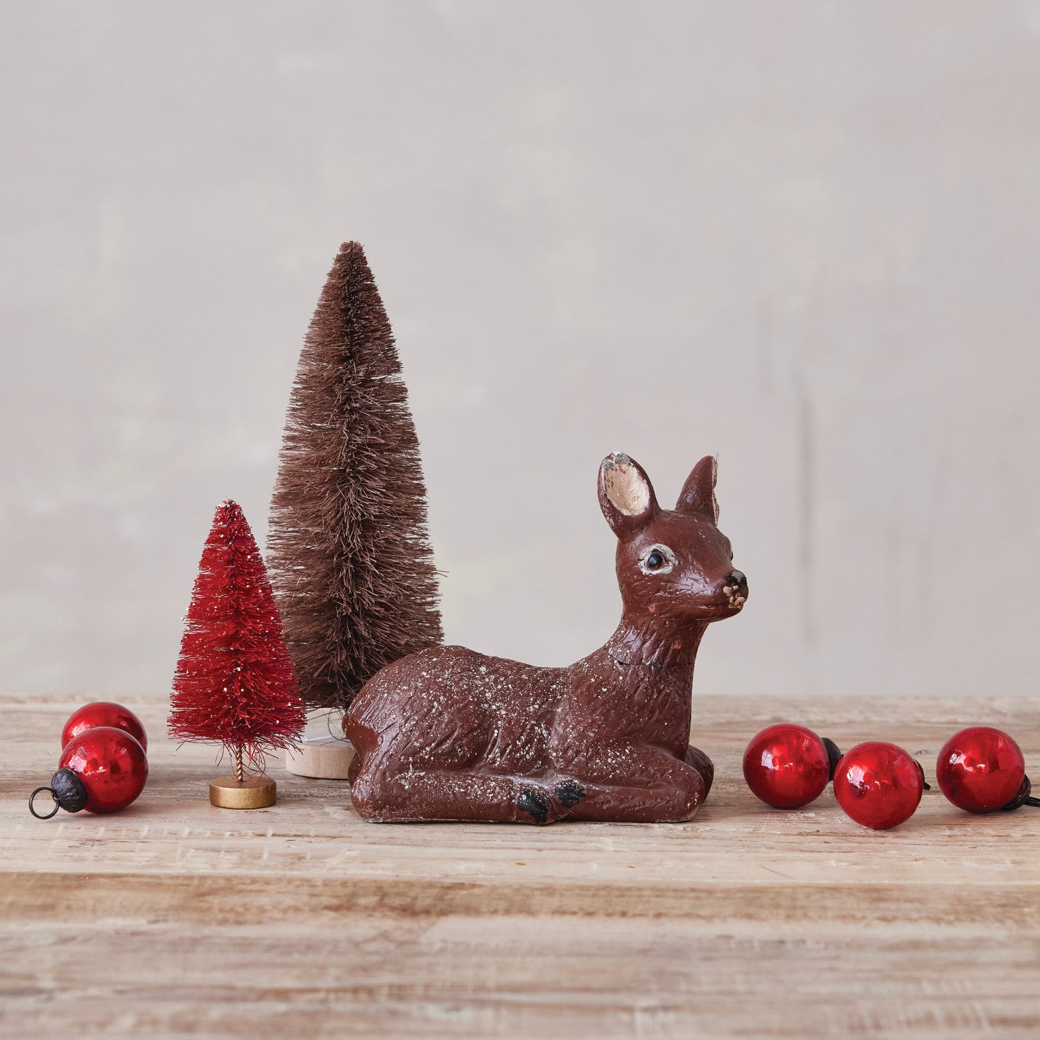 This charming lying deer figurine captures a nostalgic woodland feel with its handcrafted, vintage-inspired design. Made of solid painted cement and finished with a lightly distressed texture, it evokes the look of an old-world collectible. The soft brown tone and subtle weathering lend warmth and authenticity, making it perfect for holiday displays or year-round rustic décor.