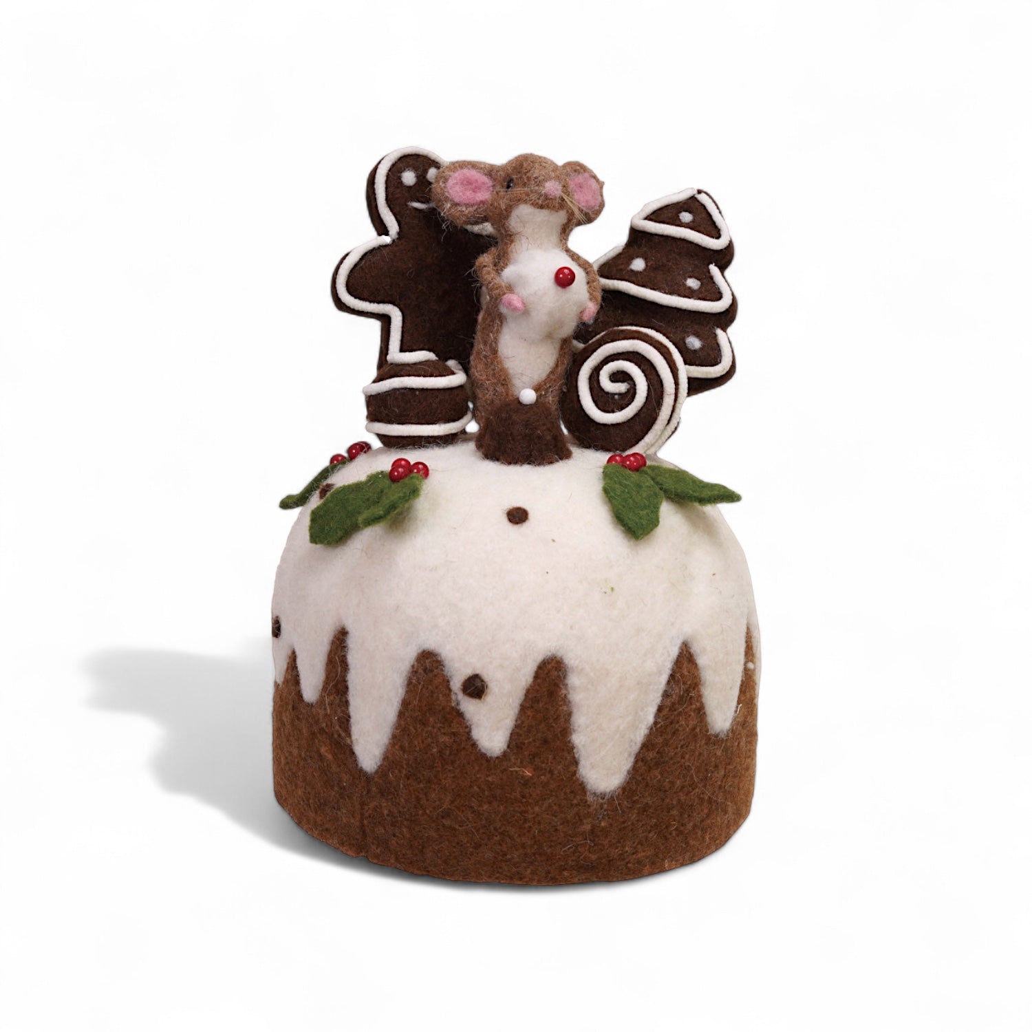 This handmade wool felt cake is a sweet addition to your holiday décor, featuring an adorable felt mouse surrounded by gingerbread cookies, holly leaves, and candy details. Crafted with care from soft felt, it brings a whimsical, cozy feel to any Christmas display — perfect for tiered trays, mantels, or dessert-themed centerpieces.