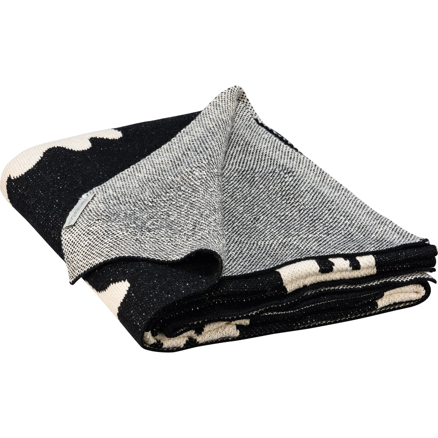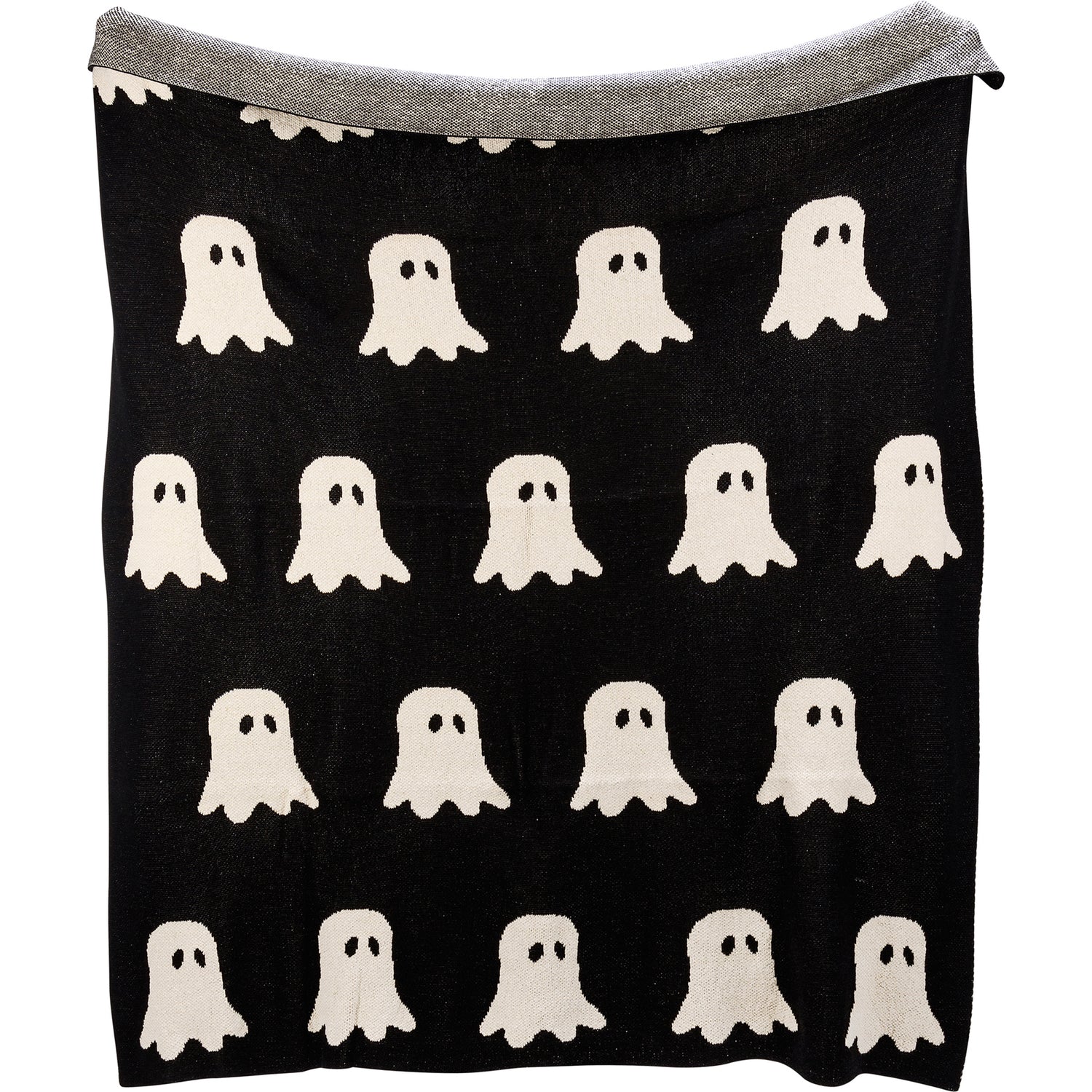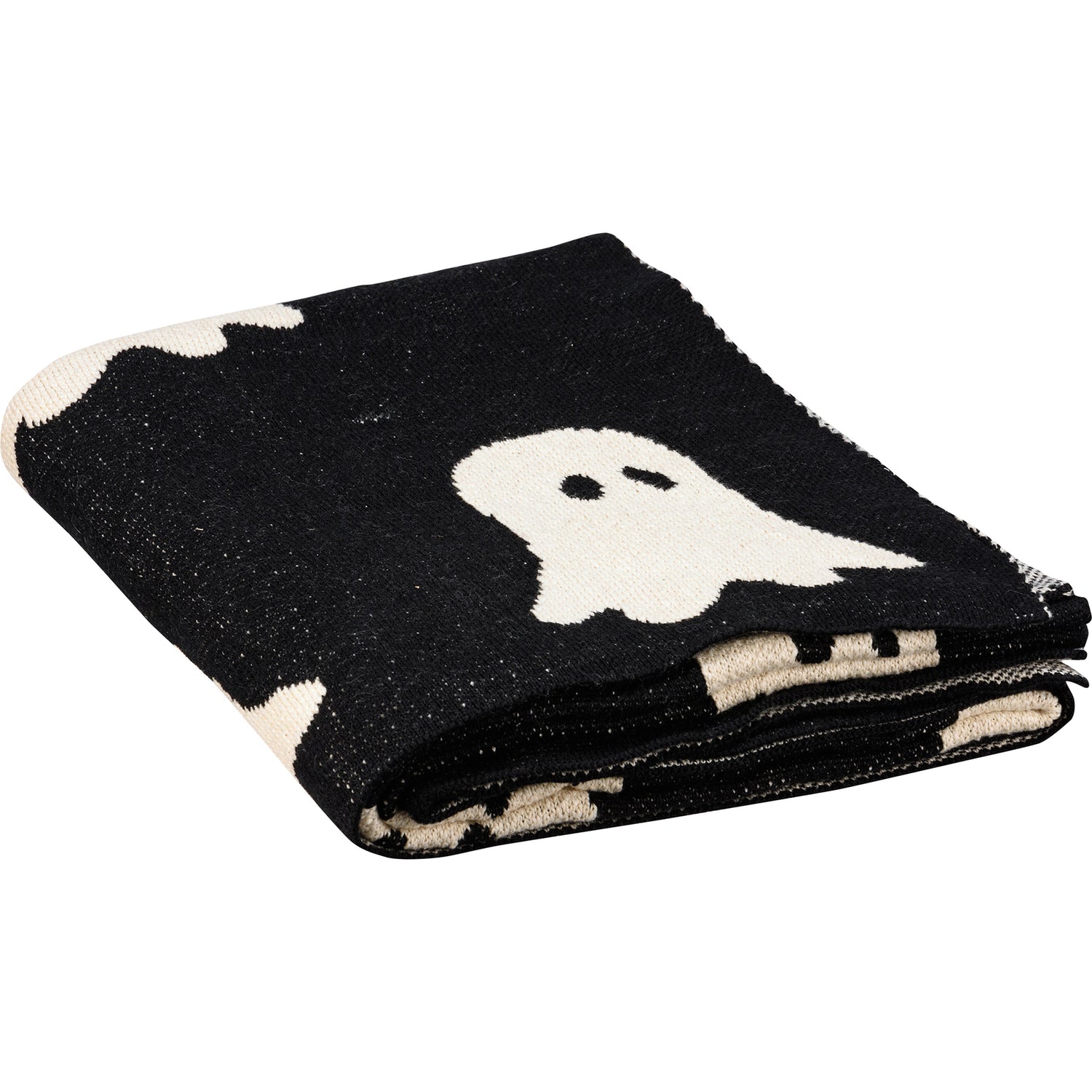 A machine-knitted black cotton throw featuring ghost designs. We wish you could touch and feel this blanket through the screen; it is made of a high-quality, tightly knit fabric. Our Ghosts throw is machine-washable!