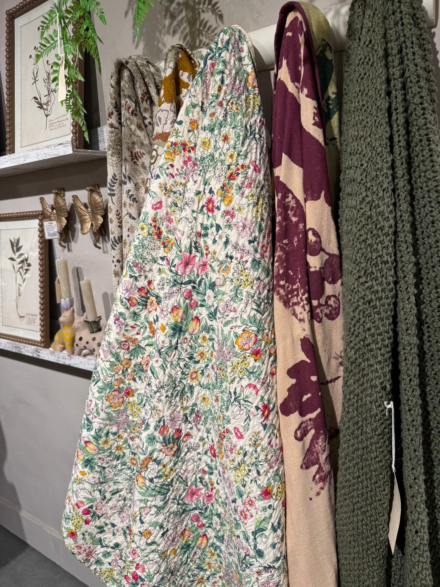 A vintage-inspired throw blanket that features a supple quilted cotton construction with a dainty floral print and decorative corner tassels, creating a charming and cozy look. This throw would add a touch of stylish warmth to any lounge space, especially for farmhouse, cottage, or shabby chic home décor styles.