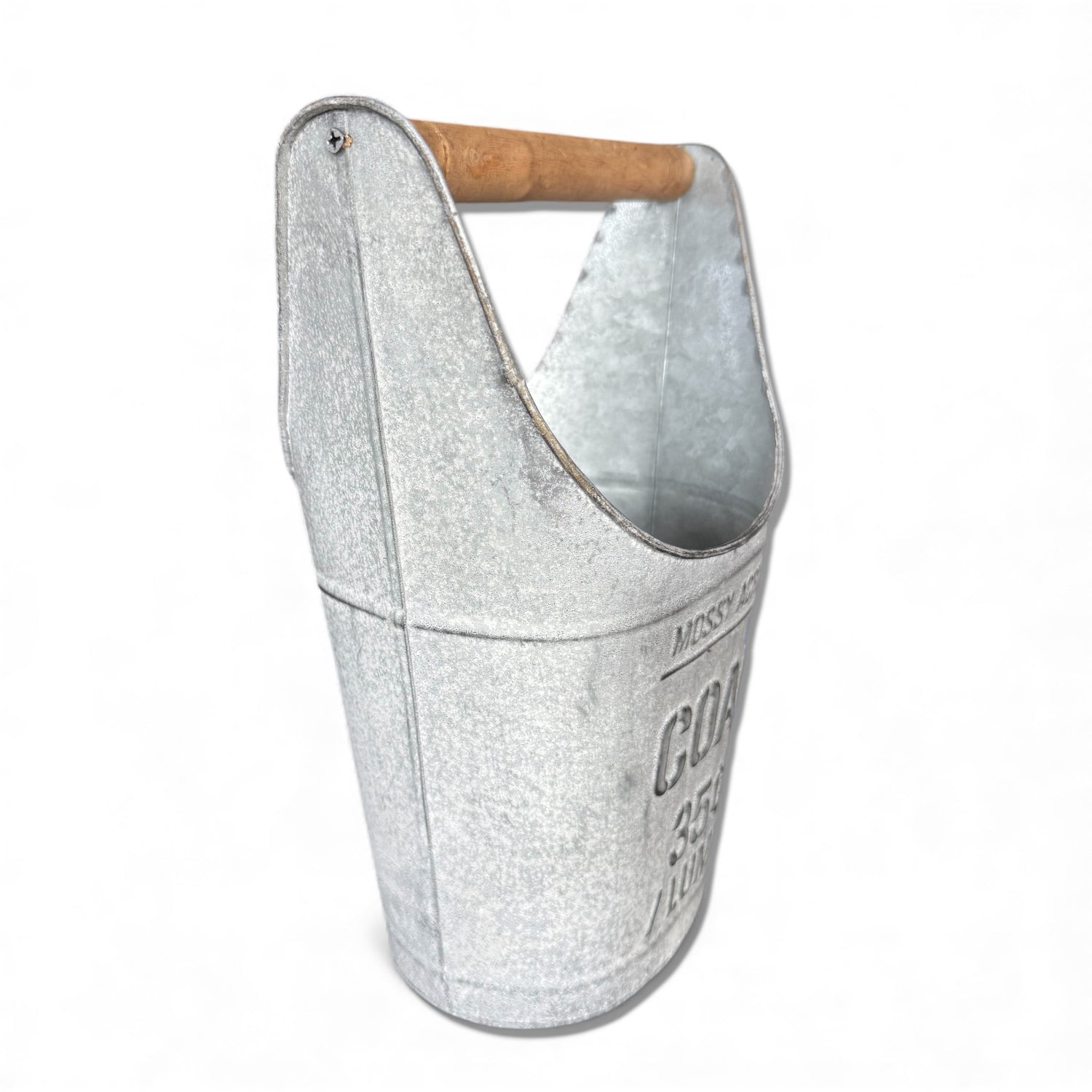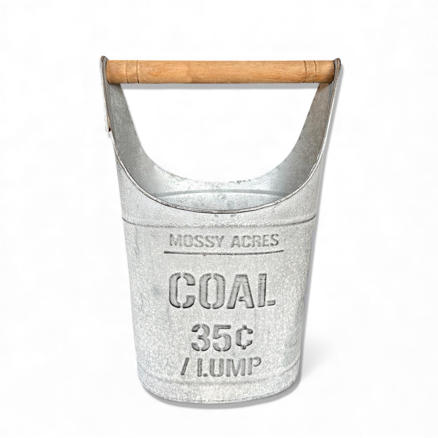 This antique-inspired coal bucket adds vintage farmhouse charm to your decor all year long. Embossed with classic lettering and featuring a wooden handle, it brings nostalgic character to any tabletop or hearth display. Fill it with artificial florals in the spring, greenery in the fall, or Christmas treats and pinecones during the holidays—the possibilities are endless.
