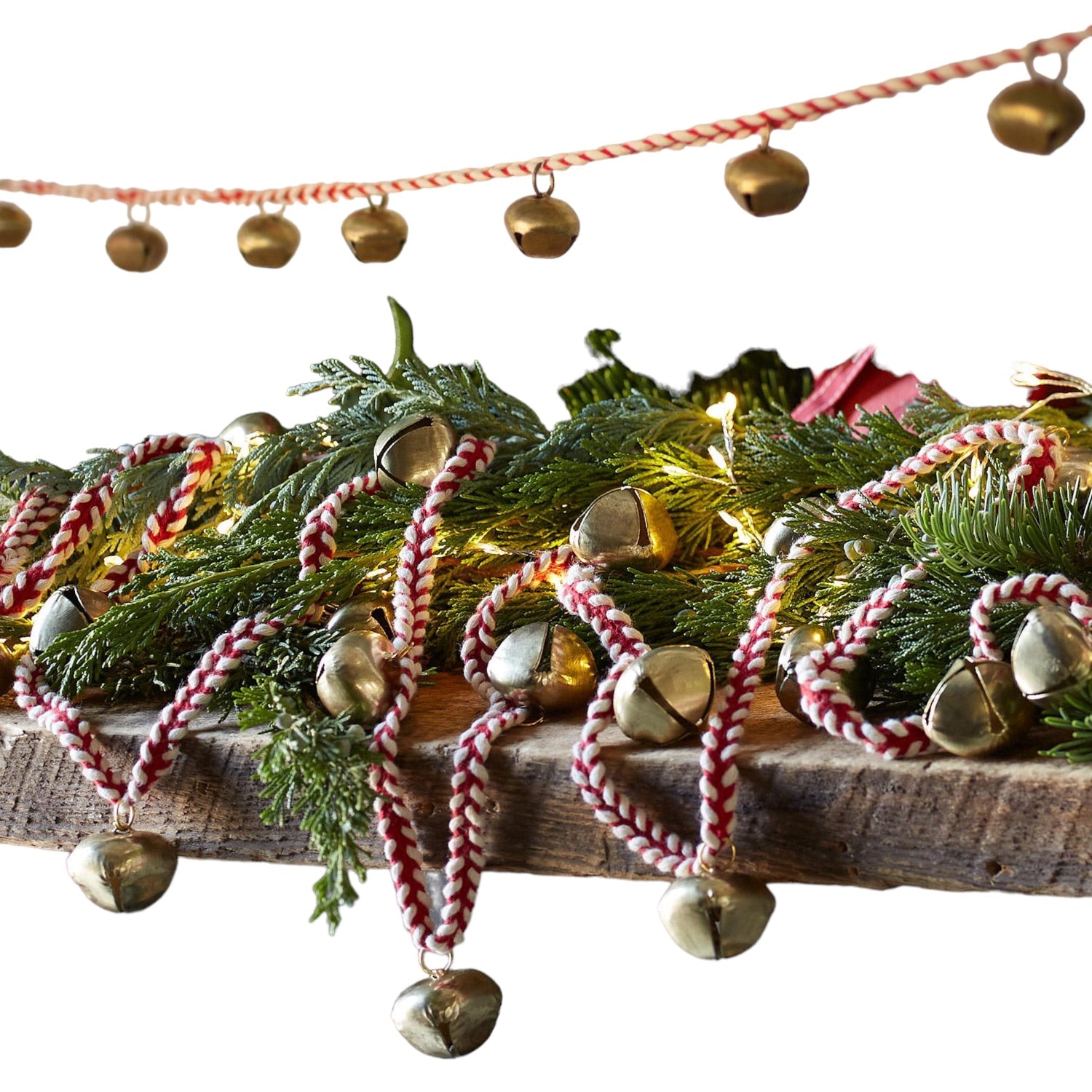 This festive garland is sure to delight with its thick, braided red and white cotton cord and golden iron and pressed metal bells that jingle delightfully. Use it to decorate your holiday tree, windows, mantels and more.