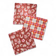 This set of dishcloths highlights warm, seasonal patterns in shades of red, orange, and pink. Two feature whimsical harvest produce illustrations, including pumpkins, gourds, figs, and florals scattered across a deep background. The third offers a bold plaid design in red, orange, pink, and gray, bringing a cozy and classic autumn look.