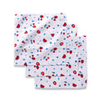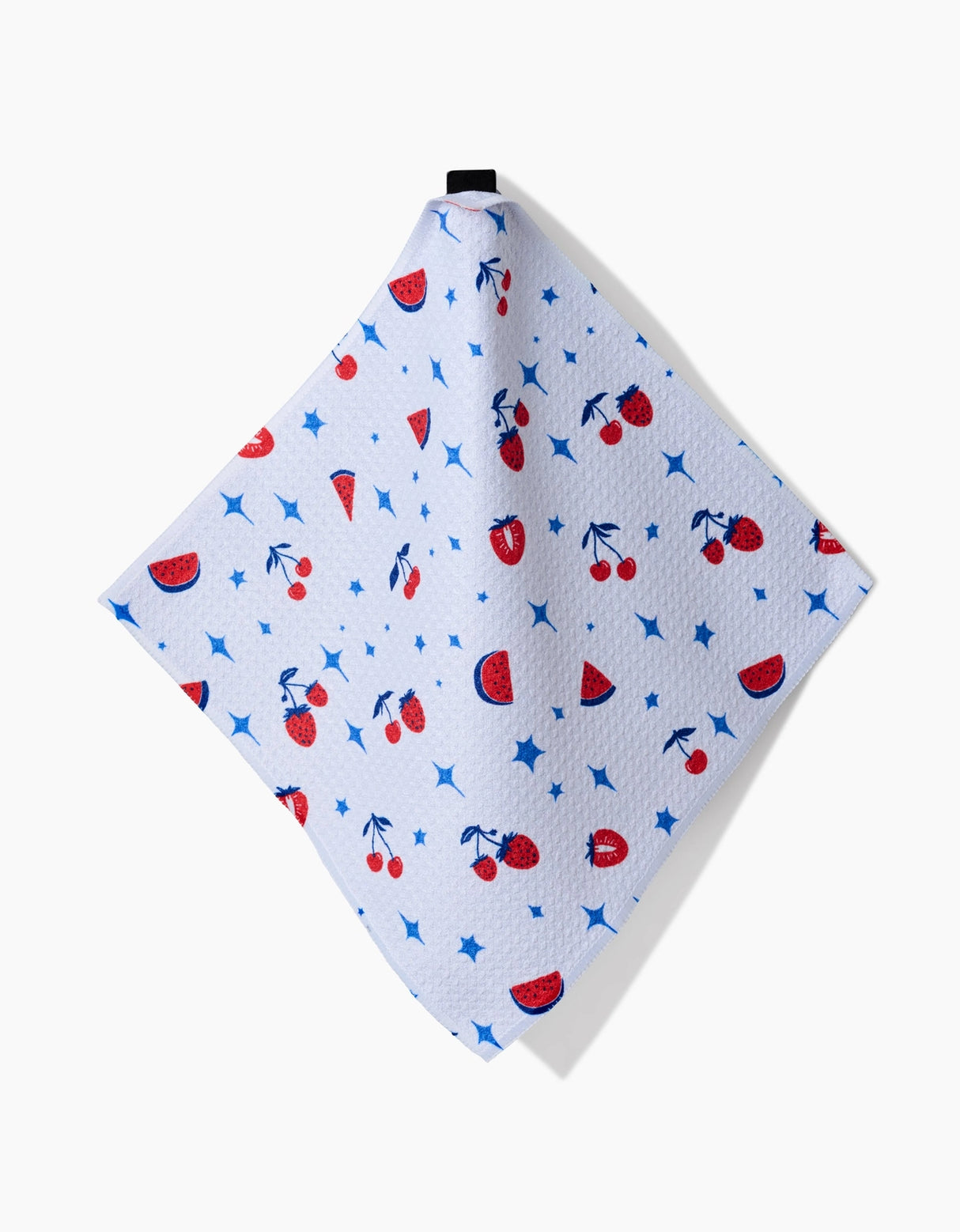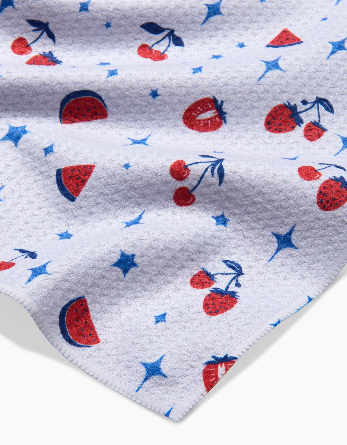 This set of dishcloths features a playful and summery design with red cherries and watermelon slices scattered across a white background. The design is accentuated by blue stars, adding a fun and vibrant touch to any kitchen, perfect for warm-weather vibes and cheerful gatherings.