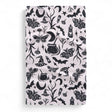 This pattern showcases a whimsical black-on-light-gray design filled with enchanting Halloween-inspired illustrations. Scattered across the fabric are playful motifs like witch hats, bubbling cauldrons, bats, crescent moons, potion bottles, stars, butterflies, mushrooms, and delicate botanical accents. The mix of mystical and natural elements creates a charmingly spooky yet elegant aesthetic, perfect for seasonal décor or themed accessories.