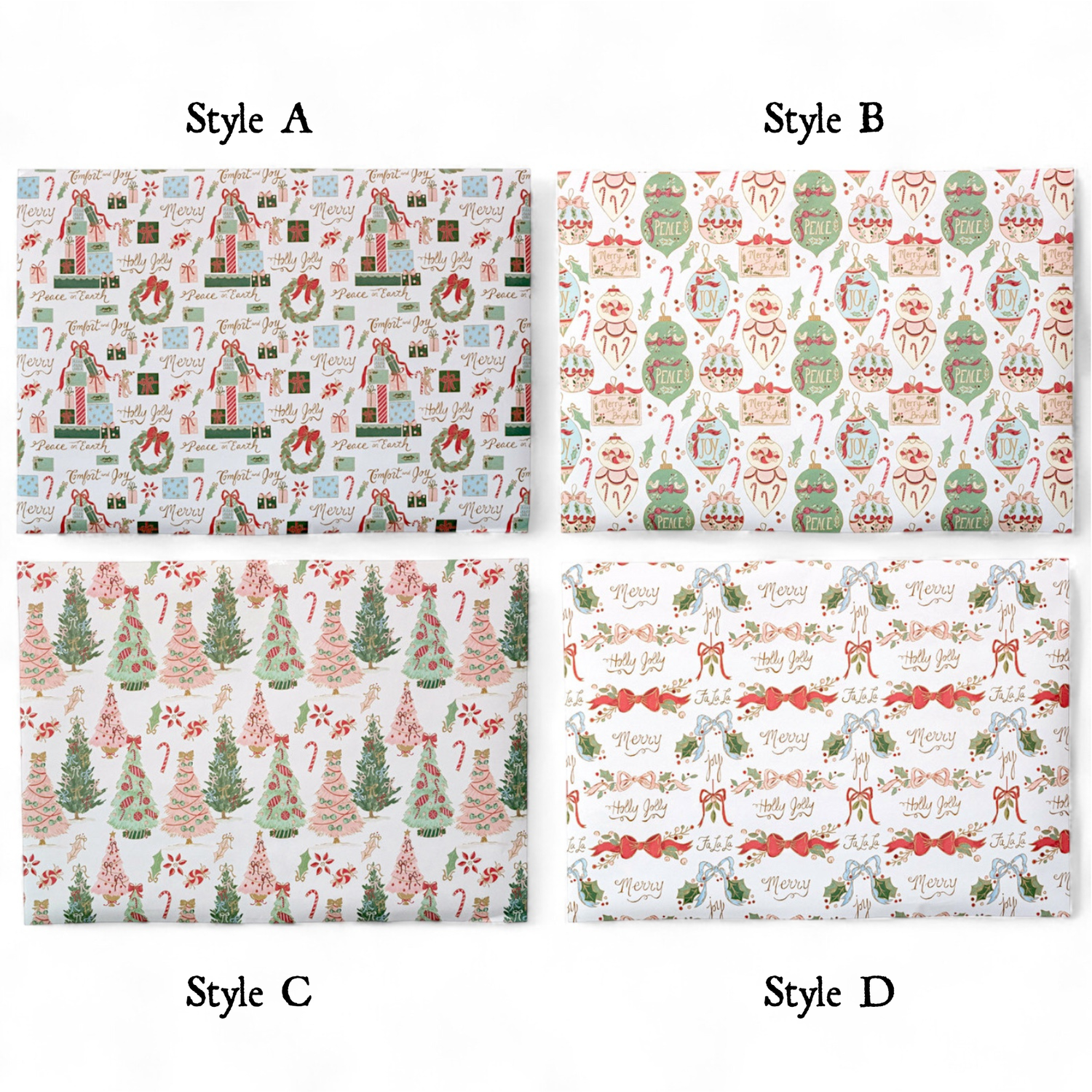 Bring festive charm to every gift with these premium holiday wrapping paper sheets. Each roll includes three sheets featuring cheerful seasonal prints—ranging from Christmas trees and ornaments to ribbons, bows, and merry messages. Printed on high-quality paper with a soft matte finish, these designs make every package feel extra special. Choose from four coordinating styles to suit your holiday theme or mix and match for a collected look under the tree.