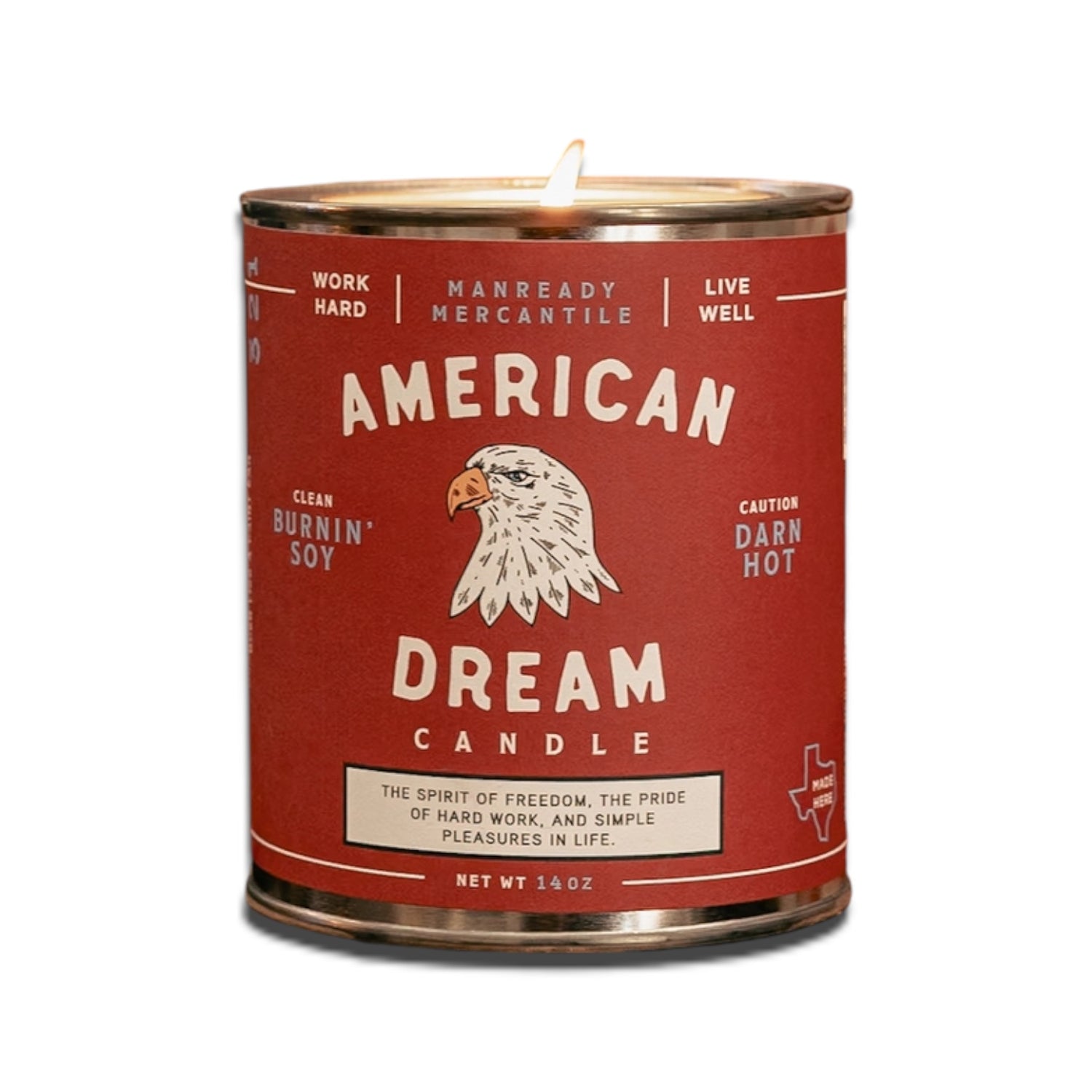 American Dream captures the spirit of freedom, the pride of hard work, and the simple pleasures that define everyday life. Part of Manready Mercantile’s Americana Series, this hand-poured soy candle features an elevated blend of bourbon vanilla, bergamot, and sandalwood for a warm, grounded scent profile. Designed in a rugged 14-ounce paint can, it brings character and intention to shelves, workspaces, cabins, and lived-in homes alike.
