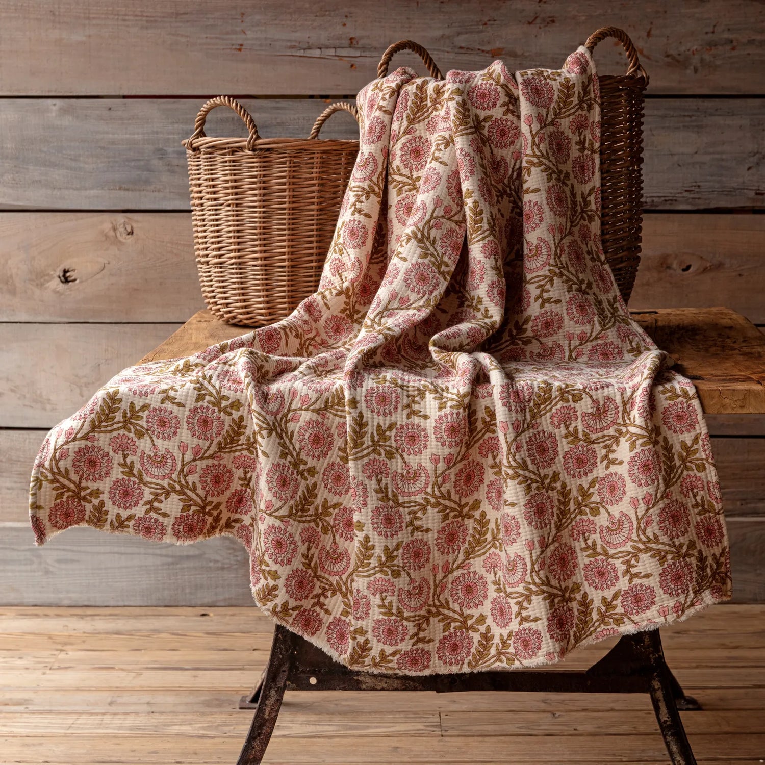 Soft florals meet everyday comfort in this Clematis Botanical Cotton Throw. Featuring an intricate pink and olive floral pattern inspired by traditional block prints, this lightweight throw brings warmth, texture, and old-world charm to your home. The detailed botanical design feels both vintage and fresh, making it an effortless layer for sofas, armchairs, and the foot of a bed.