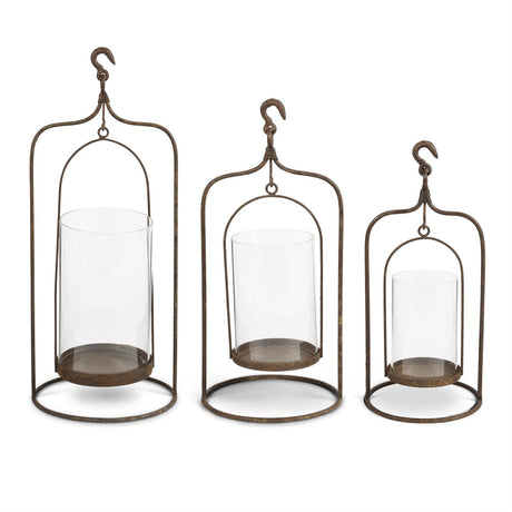 Rustic Metal Hanging Candleholders w/Swinging Glass Hurricane