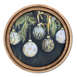 Celebrate the beauty of the season with this festive 8" round canvas featuring five elegant vintage-style ornaments hanging from pine branches. The rich gold, ivory, and green tones pop against a dark background, creating a warm, nostalgic look. Printed on premium canvas and mounted on a wood backer, this piece is finished with a double-layered wood frame stained in a neutral Early American tone for a timeless holiday display.