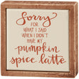 A small wooden box sign displaying a fun fall inspired sentiment in a unique hand illustrated style that reads "Sorry For What I Said When I Didn't Have My Pumpkin Spice Latte." Box sign features a natural wood frame and faux enamel finish behind design for a tile-like appearance. Our Pumpkin Spice Latte mini sign is easy to hang or can free-stand alone.