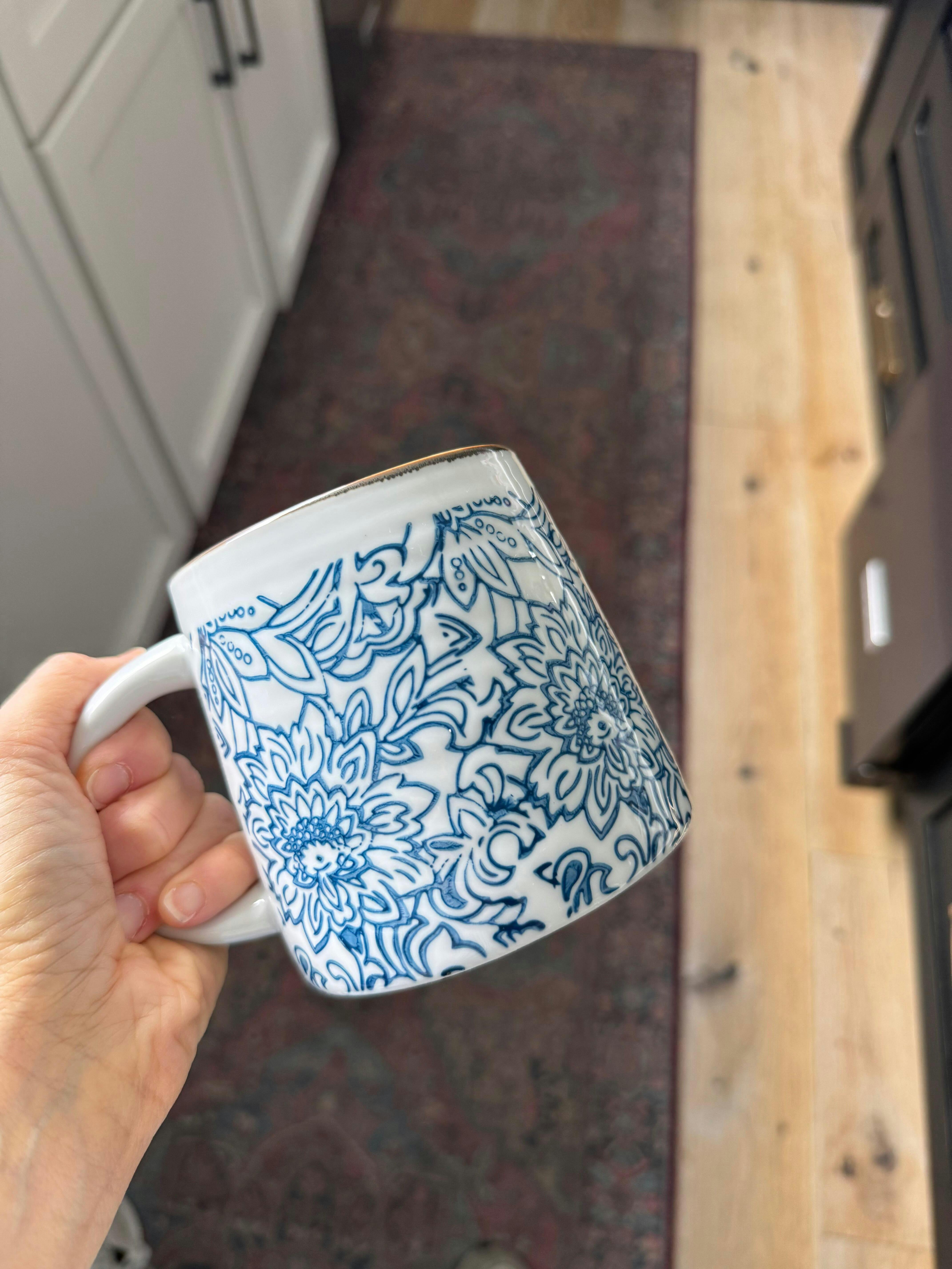 Hand-stamped with a design of its own, each of these mugs features a different floral scene with varying shades of blue. Framing the rim of the mug is a decorative circle of gold. Adding these mugs to the dinner table will bring a sense of delicate elegance. Pair with blue napkins and vivid blue candles in the center for a truly exquisite setting.