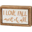A wooden box sign mini featuring a hand lettered "I Love Fall Most Of All" sentiment and tile-like finish. Easy to hang or can free-stand alone.
